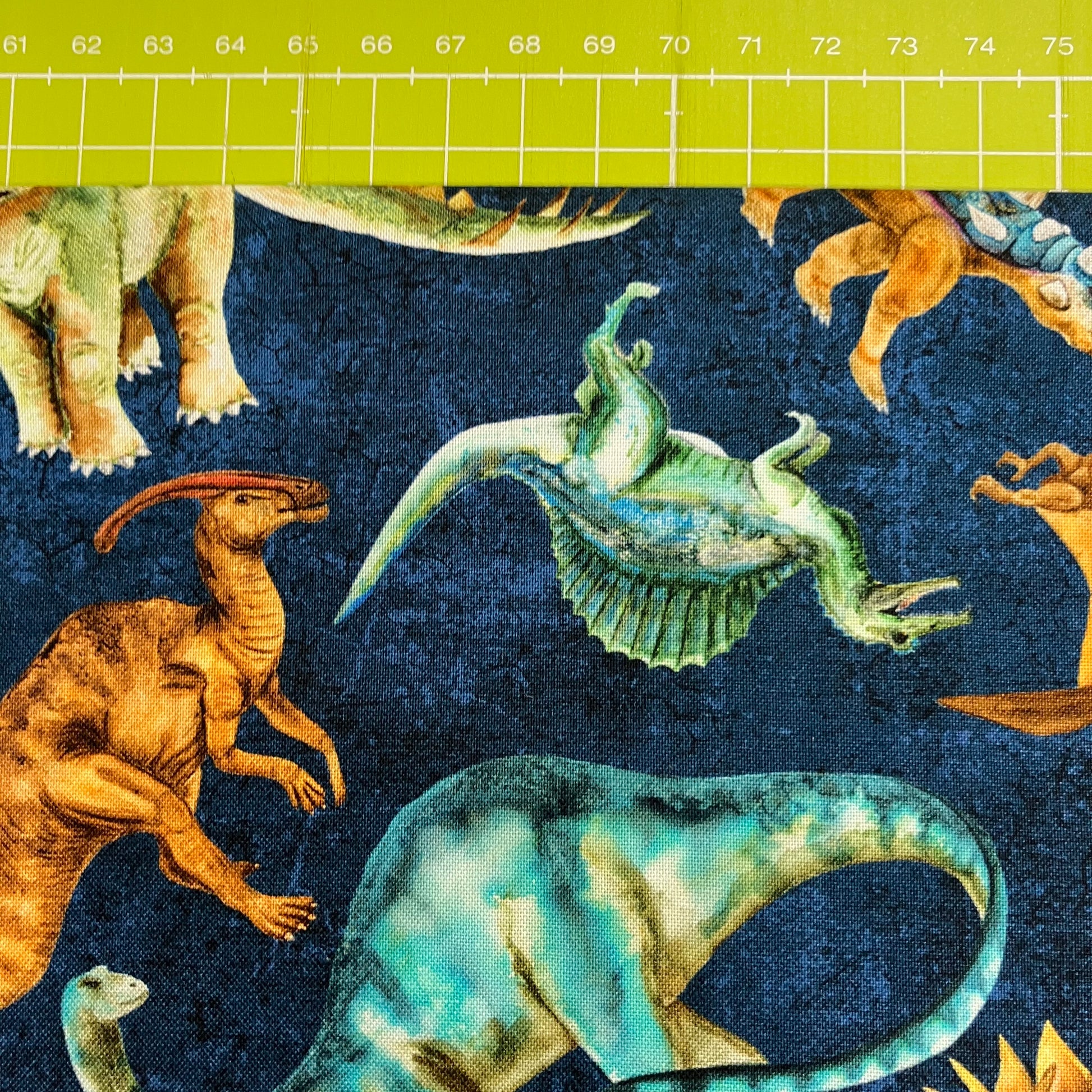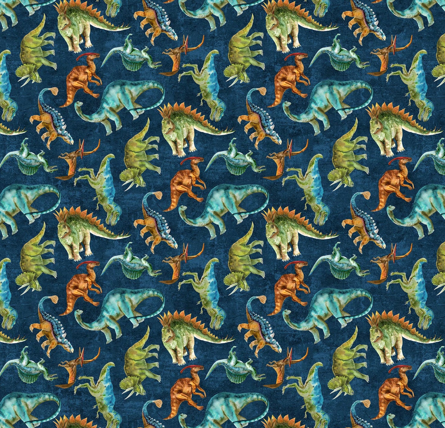 Perfect for dinosaur enthusiasts, this excellent Northcott fabrics collection includes a panel, a dinosaur toss print, and fun dino-themed text.