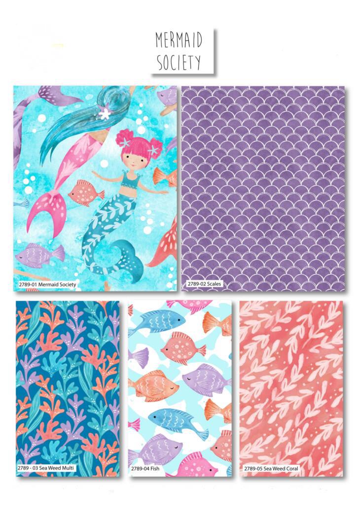 Mermaid Society is a very sweet fat quarter bundle of 5 designs. Each fat quarter measures approximately 45cm x 53cm (18” x 21”)