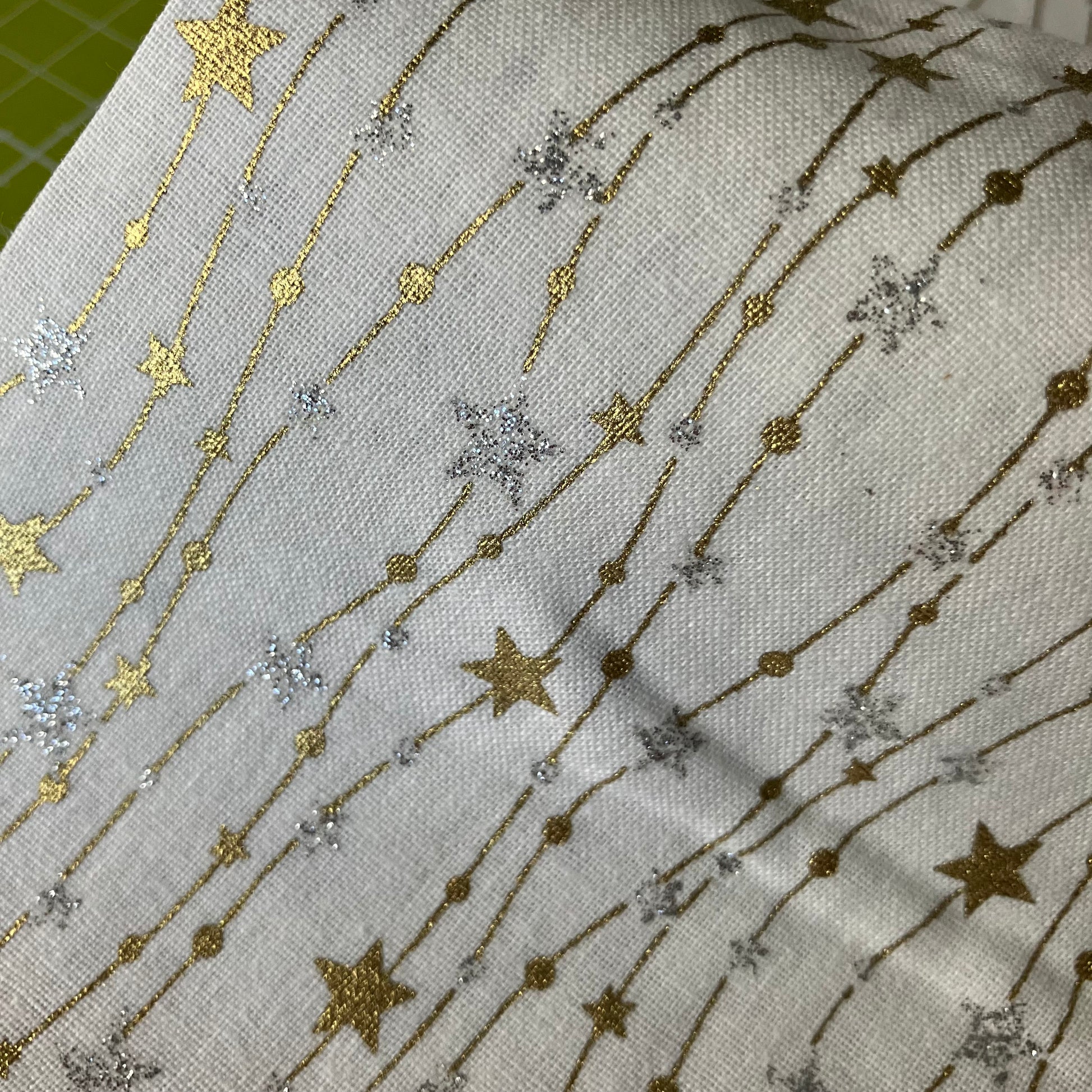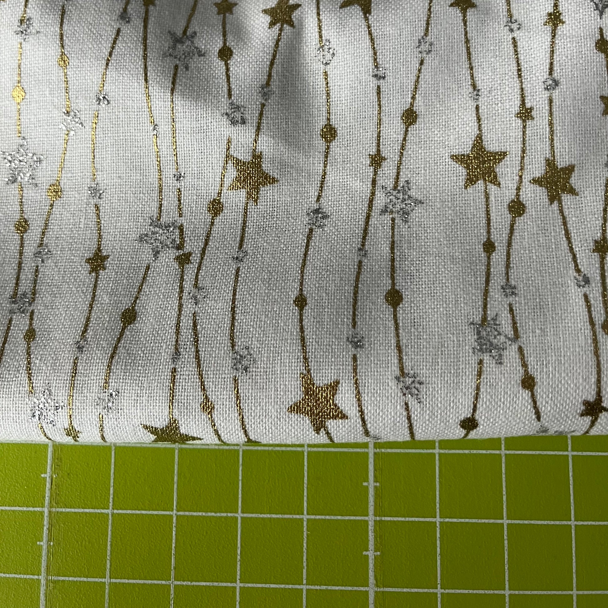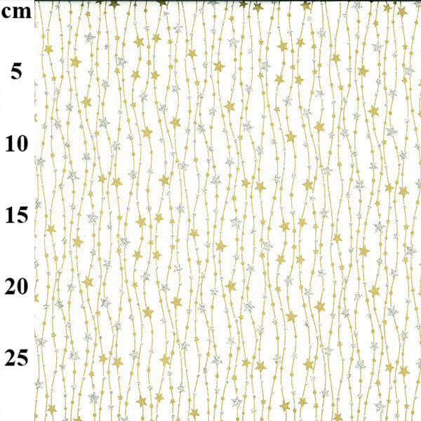 Gold metallic streamers and glittery silver stars on a white background by John Louden.